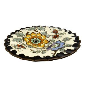 This rare hand-painted ceramic plate showcases a vibrant floral design in warm yellows, blues, and reds, complemented by a scalloped edge.