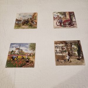 Please read Change to listing. Vintage Tiles, set of 4 hand decorated 6 x 6 inch made in Holland 1984. They usually sell on line for $24 to $40 each. I just noticed a small chip on the fish net tile so I'm replacing it with the shoe maker. So you will get 5 tiles instead of 4.