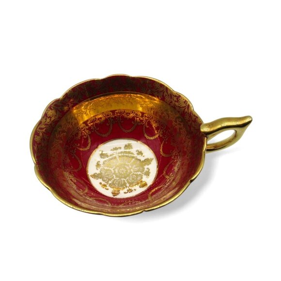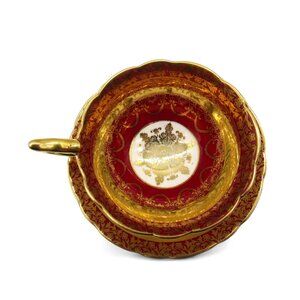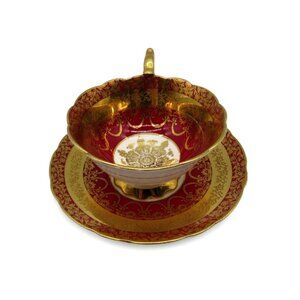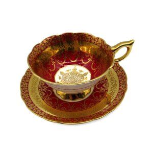 A fine display of intricate craftsmanship, this Royal Stafford tea cup and saucer set is adorned with luxurious red and gold filigree.