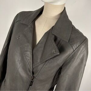 This Roz & Ali leather jacket in a sleek gray hue features an asymmetrical front zip and a notched lapel collar, embodying the classic moto style. Its fitted silhouette and structured design make it a versatile piece for any occasion.