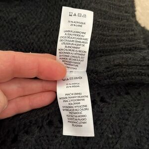 RUBY MOON black cardigan mid length open style. The back has a pretty pattern. Wool blend material so you can machine wash cold delicate cycle. Add a belt to this style or keep it open. It’s very versatile.