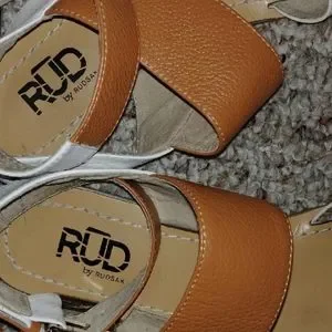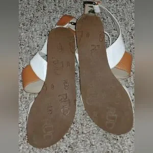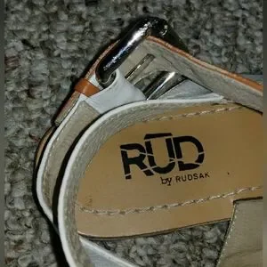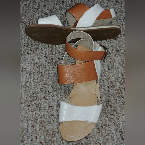 RUD by Rudsak sandals. White and brown flats, strap wraps around ankle, buckle closure, quality pebble leather.