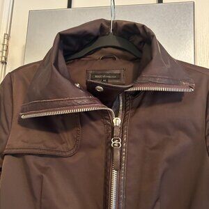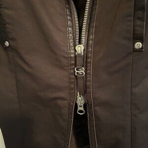 Step into timeless sophistication with this RUDSAK Collection women’s coat — a stunning blend of urban edge and elegant tailoring. Designed in a rich espresso brown, this piece perfectly balances fashion and function. Crafted in a deep espresso brown, it features a streamlined silhouette with two-way front zipper, snap closures, and high structured collar add a modern moto-inspired flair. Body is water repellant nylon with leather trim and sleeves accessorized with genuine leather. Suitable for all seasons.