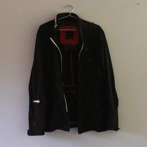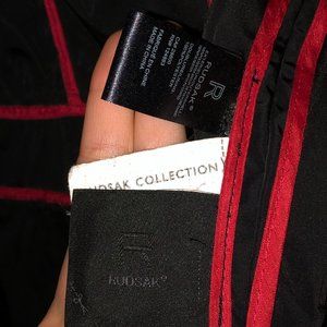Medium Rudsak utility / military / trench jacket in black with bright red inside piping. Button and zipper front closure. White zipper, many storage compartments. Four functional front pockets. Fabric is a smooth slightly reflective nylon. Has underarm eyelets for ventilation. Retractable hood can fit inside a zippered compartment. Length is around mid-thigh. "Gender" of item appears unknown. I think it's a unisex item.