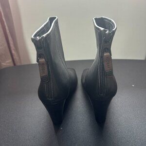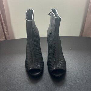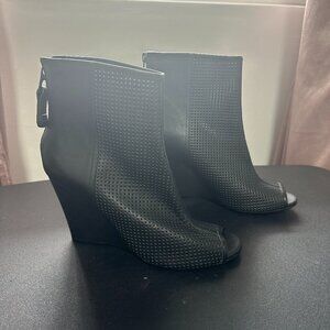 Leather wedge booties with open-toe feature. 95mm heel (3.5”). Back zippers (one is a little tight when opening but it's not broken). Never worn!