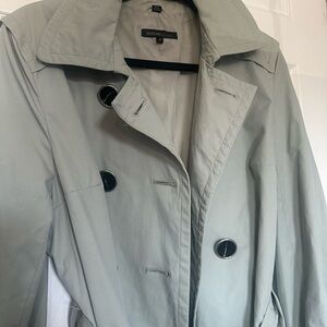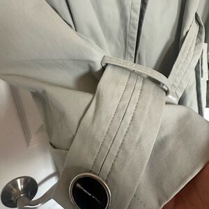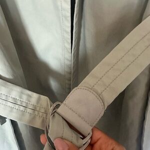 • Design: Mid-length trench with matching belt and leather accents on belt + back
