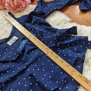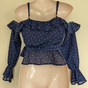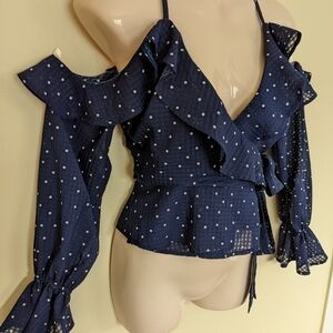 RUNAWAY polka dot blue and white off the cold shoulder ruffled wrap top blouse s