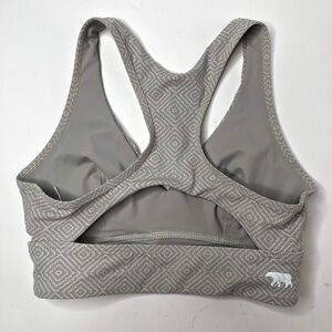 Made in Australia! Running Bare smokey grey activewear sports bra with a geometric diamond print in white. Racerback style with a cutout below it. V in the front with a wide bottom band. In excellent used condition with no flaws and no cracking on the bear logo. Please see photos for measurements and details. Women’s CAD size 4.