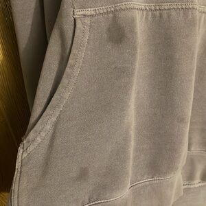 Used condition men’s size large mauve/light purple/ grayish hoodie. Holes in sleeve cuffs. A few stains and ripped at the collar, secured with pins.