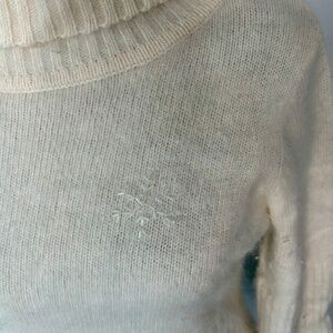 This RW & Co cream sweater is beautiful and cozy. It is a size large. The fabric has a fuzzy texture and is comprised of 50% Lambswool, 40% Angora and 10% Nylon. This sweater has a turtleneck that can be styled in a number of positions. The beaded snowflake on one side of the chest adds a special detail. The sleeves are full length. This comfortable and attractive sweater is ideal for fall and winter. This sweater is in excellent condition.