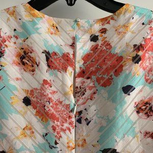 RW & Co multi colored floral lined chiffon knee length fit & flare dress with scuba neck, full skirt, and button detail in back. Like new. Size 8