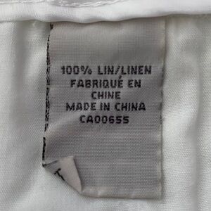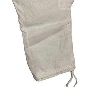 Features: White Cargo Capris, drawstring hem, 2 button flap back pockets, 2 front pockets, 2 side cargo pockets, belt loops, adjustable straps to change waist, zipper fly and button closure, breezy linen, summer, cottage, lightweight, outdoors, travel, cruise, vacation, beach