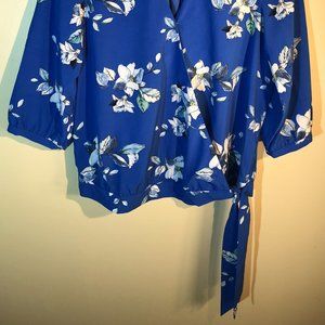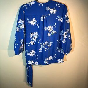 RW&CO Blue Floral Wrap Blouse-XS. 3/4 length sleeve, crossover wrap with snap and tie at waist. Looks great over a little white camisole & paired with jeans. Only wore a few times and is still in excellent condition.