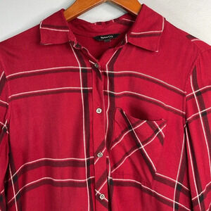 RW&CO Burgundy Plaid Brushed Viscose Button Up Shirt Hi Low Long Sleeve Size XS