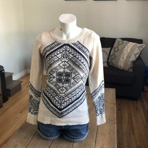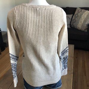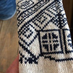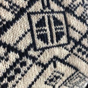 This gorgeous cream and navy knit sweater is beautiful and festive. Perfect for a Canadian winter. It is warm, but because it is a cotton wool blend it is not itchy. It has been worn a few times but still has a lot of wear left in it. Washed and freshly de-pilled. Looks like new and is ready to go!