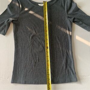 Simple, sleek - this grey ribbed tee from RW&CO. is the perfect layering essential. Designed with a flattering fit, mid-length sleeves, and soft ribbed texture. Great for casual wear, office looks, or capsule wardrobes.