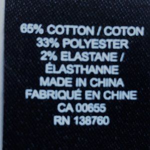 - Stretch cotton blend: 65% cotton, 33% polyester, 2% elastane