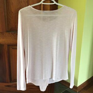 A pretty soft mauve RW&CO. tee top. A textured semi sheer tee with a cross over front panel, this long sleeve tee top is sure to make a sweet addition to your summer wardrobe.