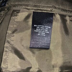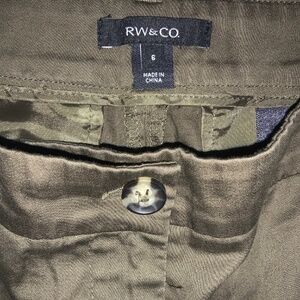 Olive green shorts with pockets. Button and zipper closure. Perfect for staying cool on a hot day.