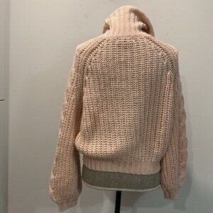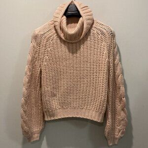 This easy knit is perfect for the fall and winter season! This is a pink, long-sleeved cropped sweater by RW & CO. It is a size S/P and features a turtleneck, cable knit detailing on the sleeves, and a ribbed knit throughout. The sweater is in good condition with no visible signs of wear or damage. The fabric is soft and comfortable.