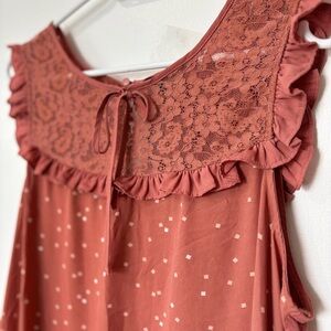 Rust sleeveless blouse with subtle polka dot print and lace/ruffle detailing at neckline. Flowy fit, breathable fabric, ideal for layering or warm weather. PTP: 22" | Length: 28"