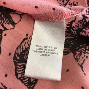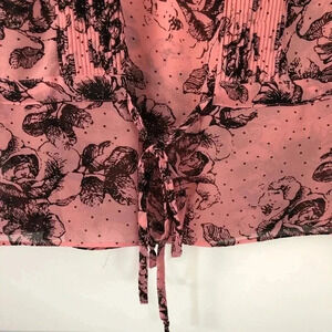 Like new! Sheer pink blouse with black floral pattern. Drawstring at waist to cinch for a different look. Keyhole back opening with button closure. Measurements: L 26” W (armpit to armpit) 20”