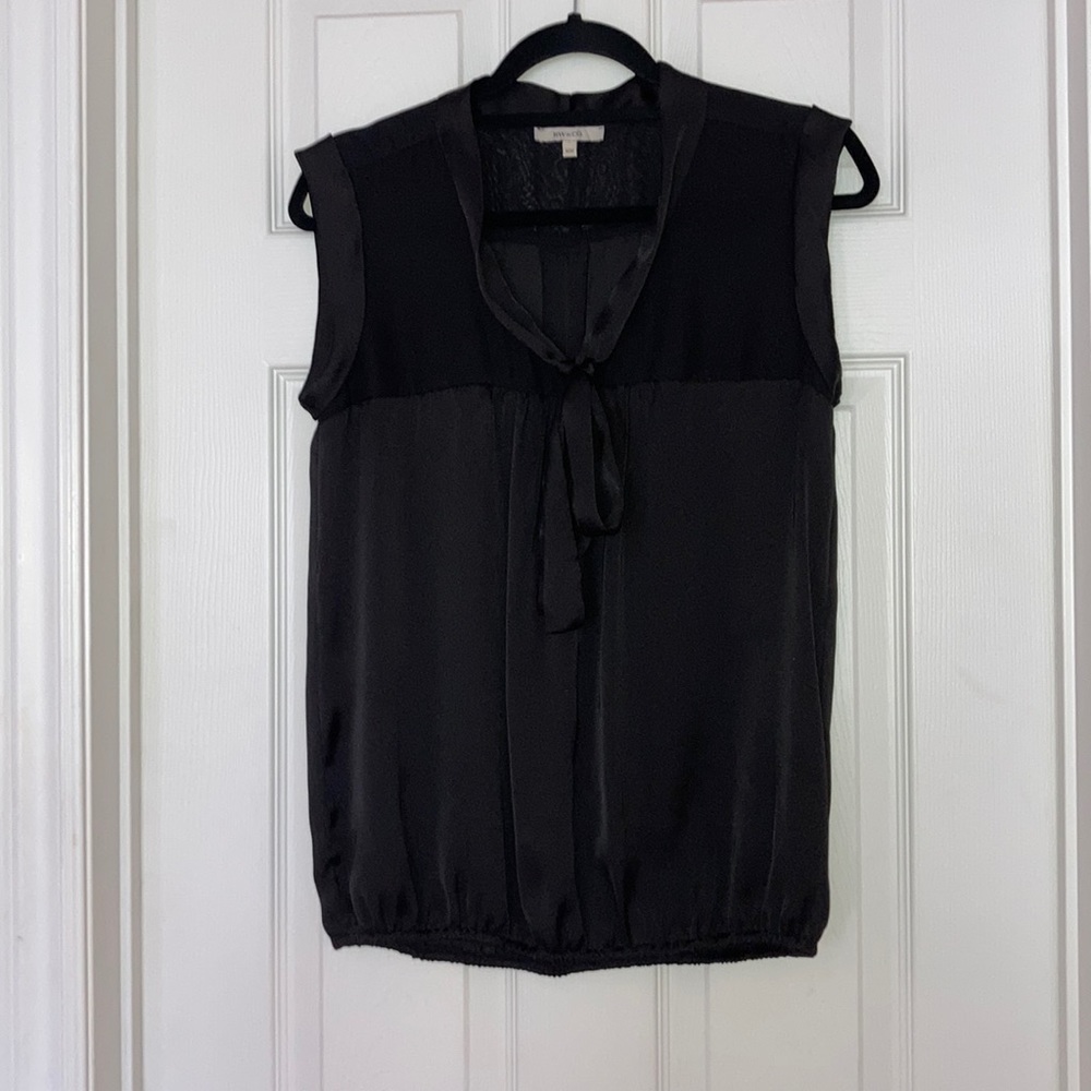 Top part is chiffon with polyester trim bow tie around neck and sleeves and elastic at waist