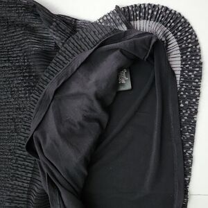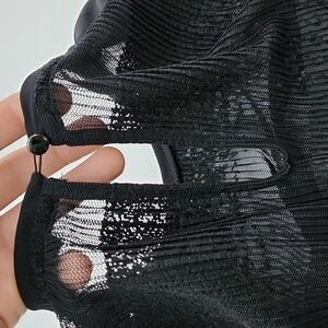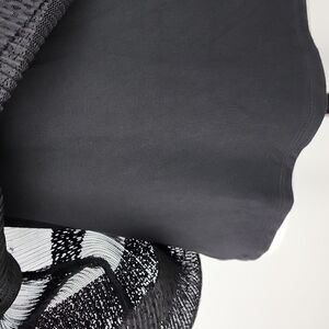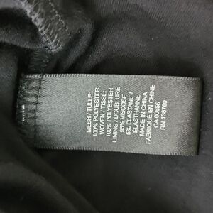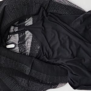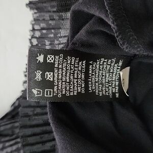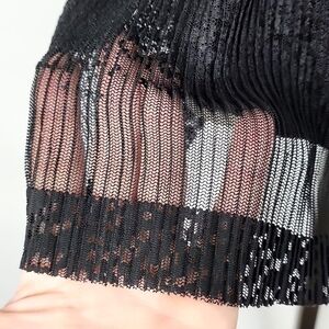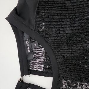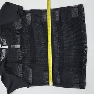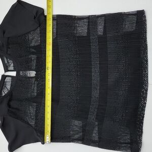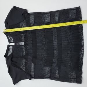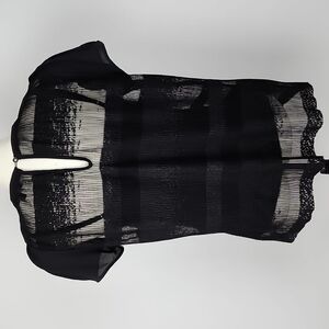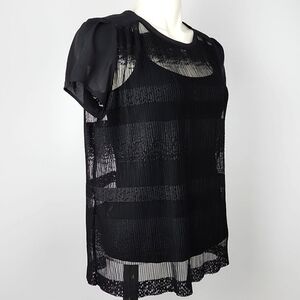 Excellent pre-owned condition, RW&CO Women's black sheer, airy top in a soft ribbed mesh lace with subtle large stripes motif, capped short sleeves, crew neckline and inner tank with adjustable straps, size small.
