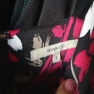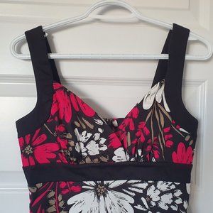 Size 4 - RW&Co. formal knee-length dress. Black background, white and red flower print. Dress is accented with black straps and black banding under the bust.