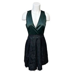Pre owned. Great condition Forest green satin dress. Black lace overlay on skirt Vneck Polyester, cotton & spandex Approximate measurements when laying flat: Pit to pit 17.5'' Waist 14'' Length 35.5''