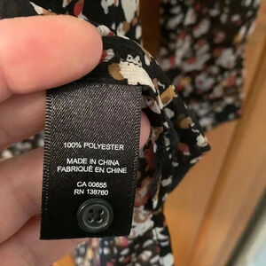 Black with small abstract pattern, colors of white, red, brown, yellow. Long sleeves with buttons on cuff. 4 buttons on chest and pockets. Pretty. Size Small.