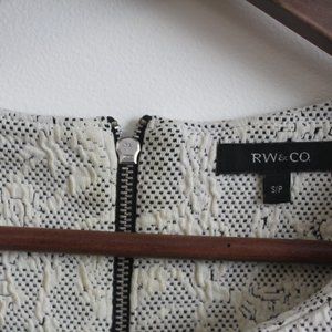 I always got compliments when I used to wear this to work! The peplum top is longer in the back and shorter in the front and is super flattering. Looks great over black skinny jeans or even a pencil skirt. The white fabric is textured and imitates lace. It's a heavier fabric, great for winter. It's listed as a small but it's stretchy and honestly would also fit a medium, still fits me at size 10.