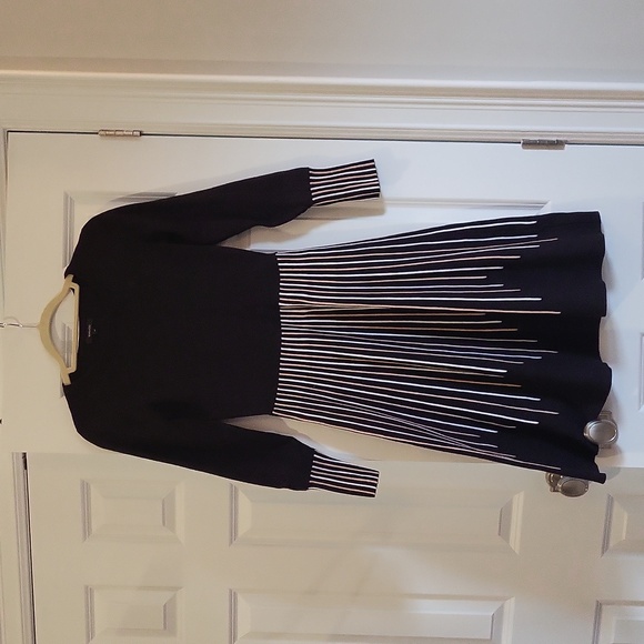 lovely cozy but elegant black dress with white and beige stripe detail. flattering style