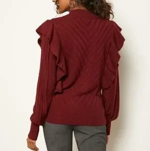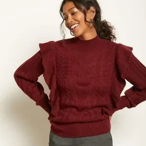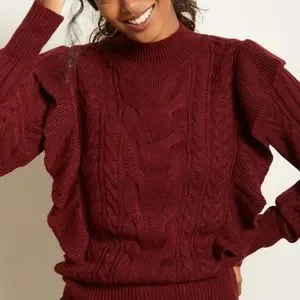 This cable knit sweater with a mock-neck gets girly with ruffles.