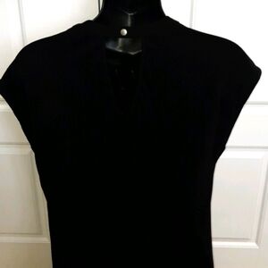 This adorable mixed-media top is an absolute dream to wash. Then you simply hang to dry. It looks fantastic. It has short sleeves and a cute little button closure at the back.