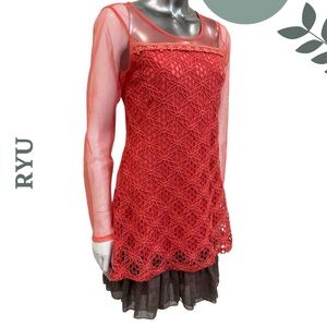 RYU Coral Lace Mesh Dress – Size Small – Sheer Sleeves & Layered Hem