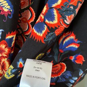 Description : Draped dress, floral pattern, round neck, cap-sleeved, front slit, shorter at the front.