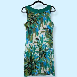 This sleeveless dress by Rabbit Rabbit Rabbit is made of 100% cotton with a 100% polyester interior. The dress is beaded with faux gems around the neck and has a green and blue abstract floral design with a white background. It also has a back zip closure.