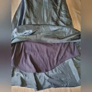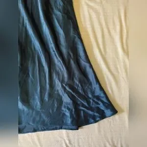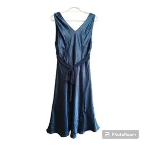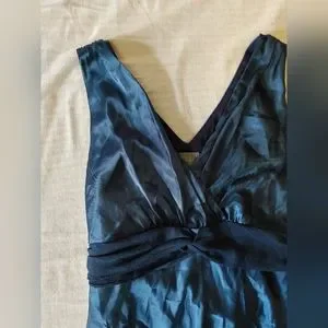 Sleeveless V-neck satin Y2K dress. Empire waist with twist detail. Elegant deep navy blue sheen. Worn once to a wedding!