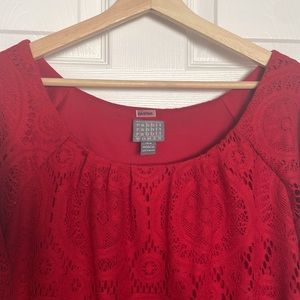 Gorgeous red lace dress from Rabbit Rabbit Rabbit. Sheer sleeves with flounce detail and lined bodice and skirt.