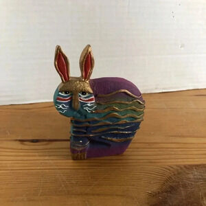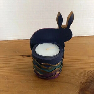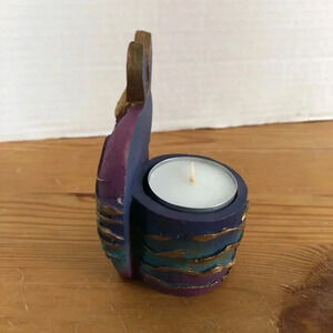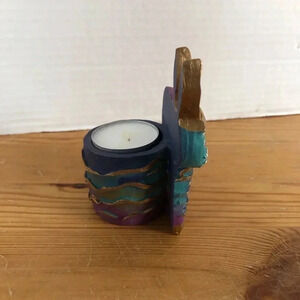 Made from a sort of resin painted in bright colours. Holds a Tealight (one included). Good condition- no major issues a couple of tiny chips on corners.