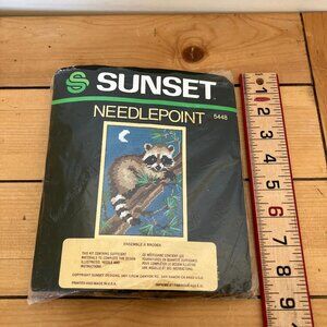 Vintage Sunset Designs needlepoint embroidery kit "Raccoon by Moonlight" #5448 from 1981. Package is open, but kit is unused and includes all contents. Finished size is 5" x 7".