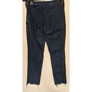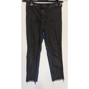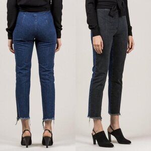 Rachel Comey Fletcher jeans in a bad-ass two toned denim. Mid-rise, side-zip denim pant, features washed black and classic denim combo color blocking and raw un-finished hem. Made in USA.
