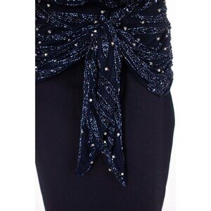 Rachel Gilbert is known for blurring the lines within eveningwear dress codes, and Jamilla Dress is proof that short dresses can be worn for dressy evening events! The navy blue dress features intricate hand beading on the bodice, which features sheer long sleeves and a knot tie detail at the waist. With its elegant black pencil skirt and sexy V-back detail, it’s the ideal dress for an evening event or an awards night.