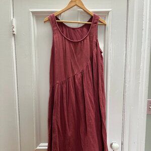 This is an incredibly light and airy, slightly crinkly material 100% cotton dress, by the now defunct brand Rachel Pally. Neat asymmetric hem, could be worn with either side as the front depending on how high the neckline you want. Midi length.