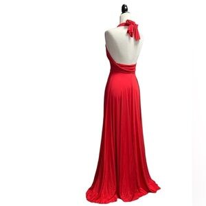 Very good condition. No rips or stains. One of those plastic thing that goes on the hanger broke, does not affect use (see photo). Multiple ways to wear this dress. Stretchy, jersey knit fabric. Second photo is a stock photo - use as reference to the actual color of the dress. Modal / Spandex