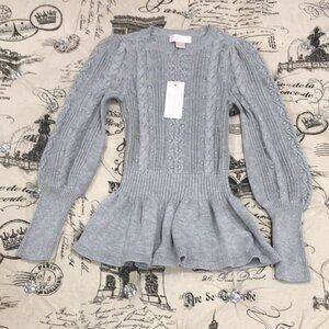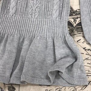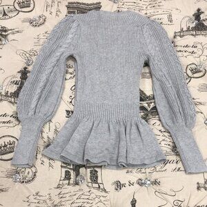 Add some charm to a chilly day in this peplum-popped sweater, knit from a soft cotton blend with puffed sleeves and cozy cabling.