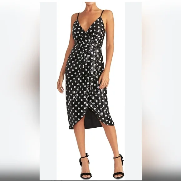 A sleek black wrap midi dress with white polka dots. Spaghetti straps and a surplice V-neck create a flattering silhouette. Gathered side detail and tulip hem add elegant movement. Perfect for evening events and special occasions. Sequin