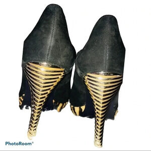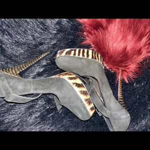 🖤⭐️Stunning show stopper! Leopard print / calf hair/ strappy black suede leather stunning gold stilettos .versatile style and perfect for night in/ out gently used about 3 times. in perfect condition.Same/ next day shipping from smoke free home
