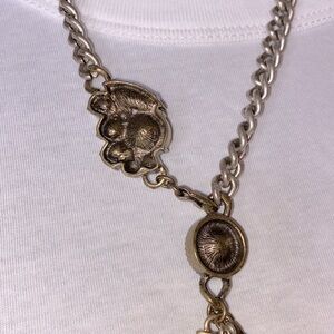 Rachel Roy boho necklace, thick gunmetal chain, charms, front hook, signed 🪶